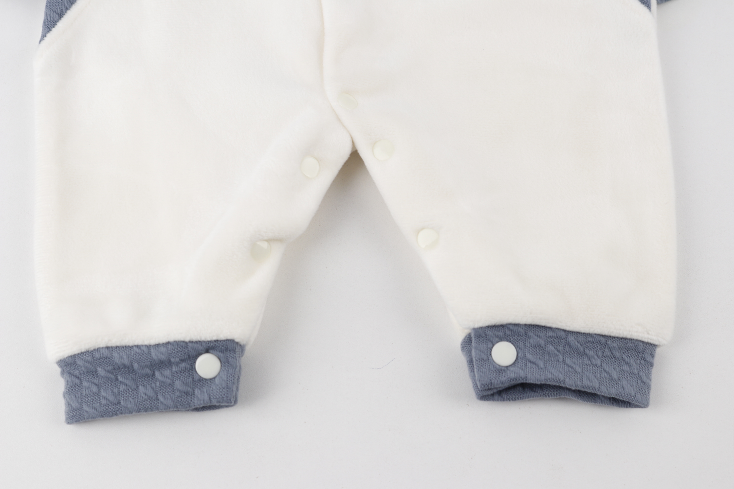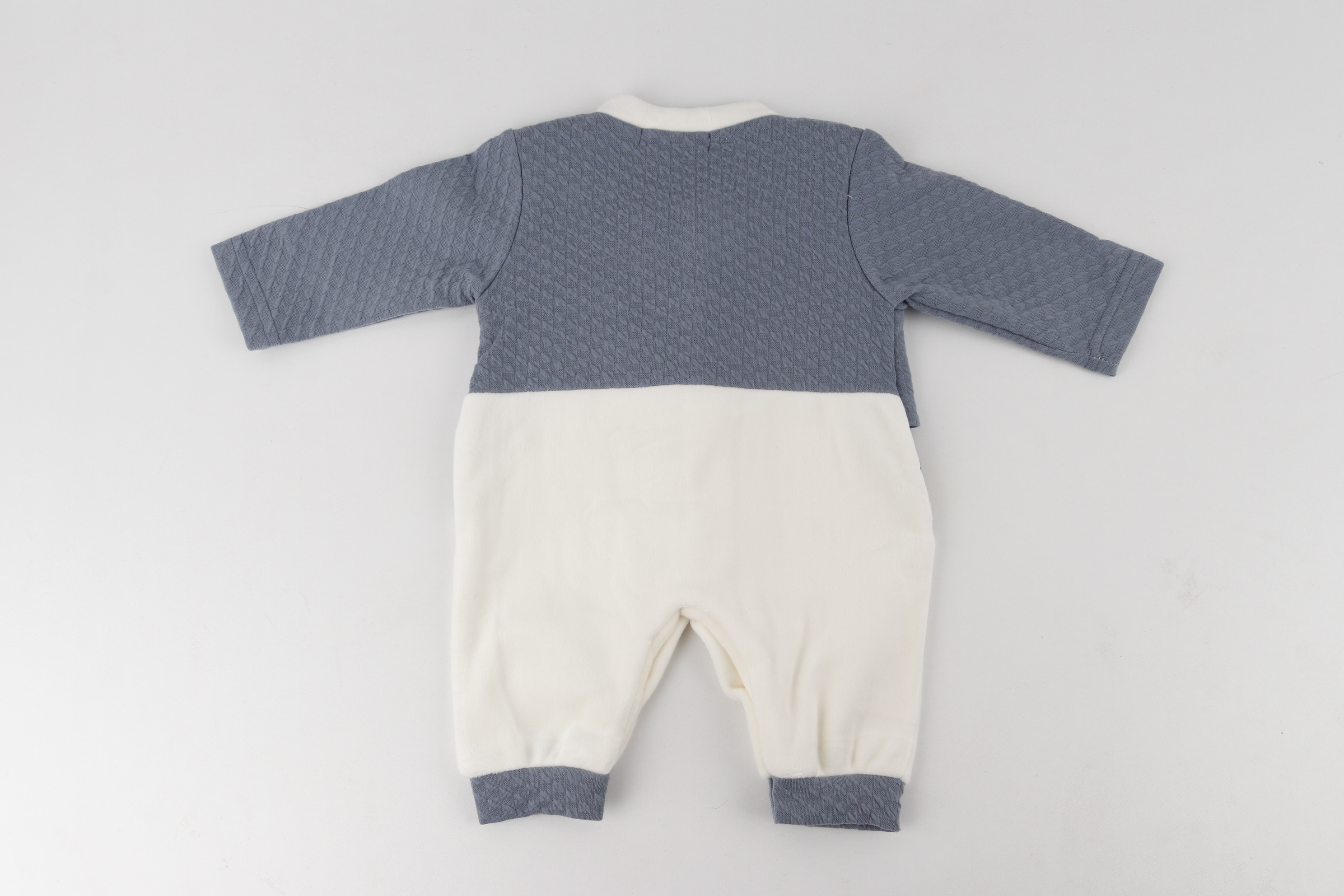 سالوبيت كامل مبطن و شتوي، مصمم بأسلوب رسمي يشبه البدلة، مع ياقة بيضاء وفيونكة رمادية صغيرة على الصدر وأزرار أمامية. الأكمام والجزء العلوي باللون الأزرق الداكن و بني فاتح، بينما الجزء السفلي باللون الأبيض الكريمي.