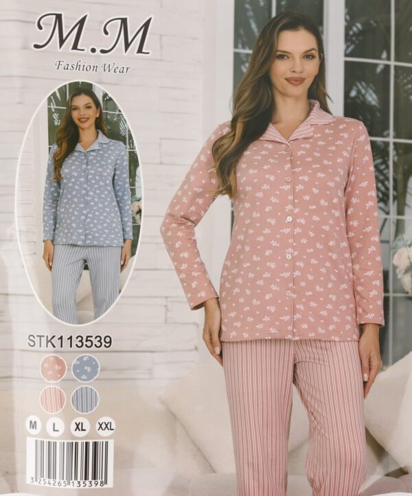تتكون من قطعتين:القطعة العلوية: قميص بأكمام طويلة، بياقة كلاسيكية مع أزرار أمامية كاملة لسهولة الارتداء، مزين بنقوش صغيرة تمنحه مظهراً أنثوياً ناعماً.