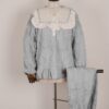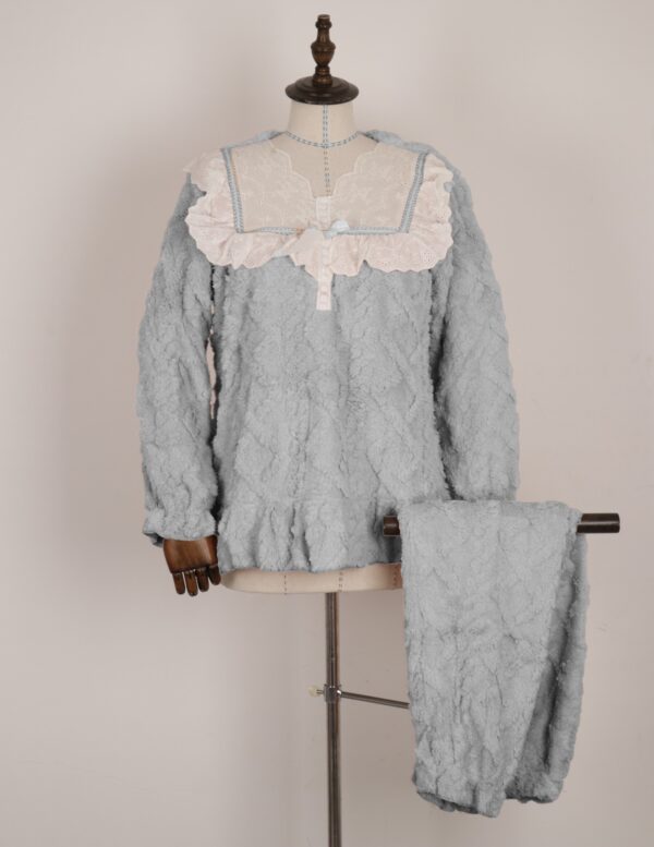 - بيجامة نسائية شتوية ناعمة من الفرو الرمادي مع دانتيل أبيض أنيق، تجمع بين الراحة والدفء مع لمسة جمالية.