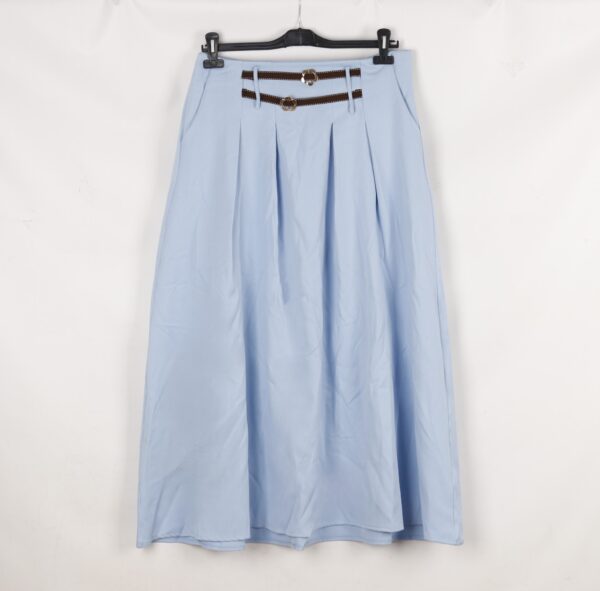 - تنورة نسائية أنيقة بعدة الوان، بتصميم طويل وواسع يمنح راحة وانسيابية في الحركة. تتميز بثنيات أمامية تضيف لمسة من الرقي، مع حزام ديكوري مزين لزيادة الجاذبية. خامتها خفيفة ومناسبة للإطلالات الكاجوال والرسمية على حد سواء، ويمكن تنسيقها بسهولة مع بلوزة بسيطة أو قميص كلاسيكي لإطلالة عصرية وراقية.